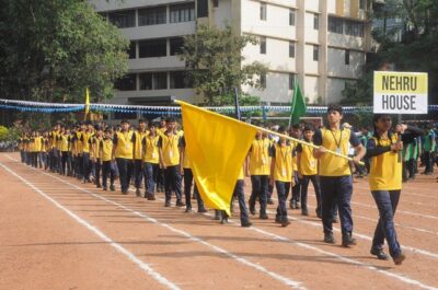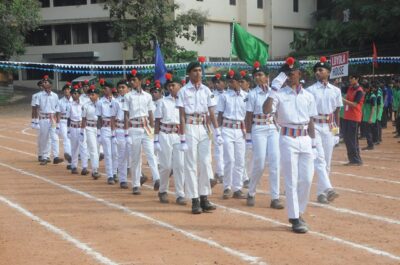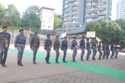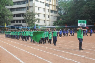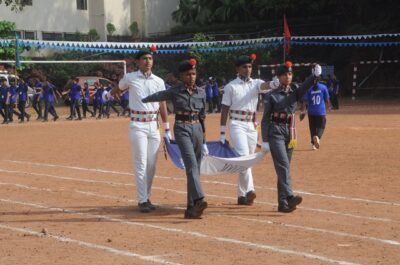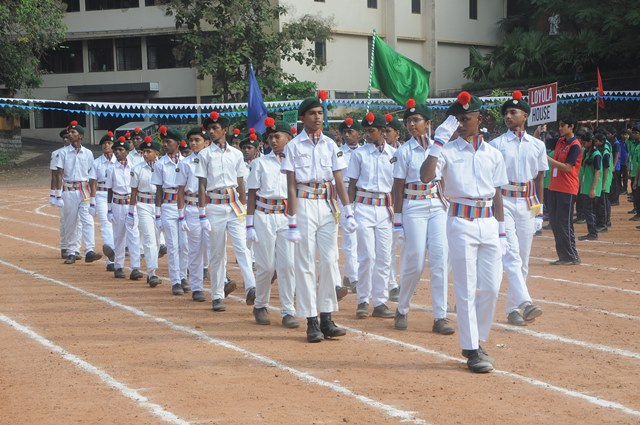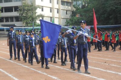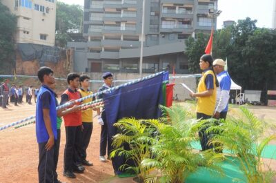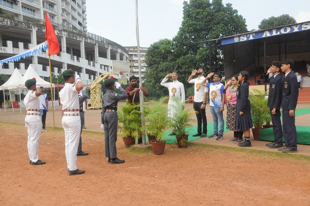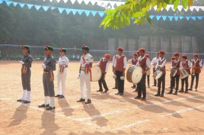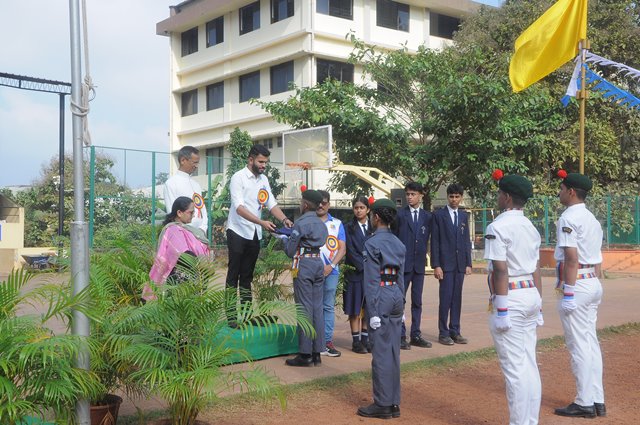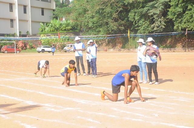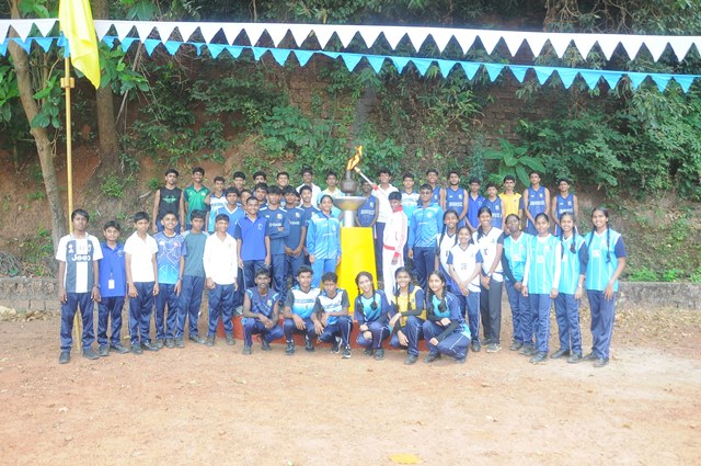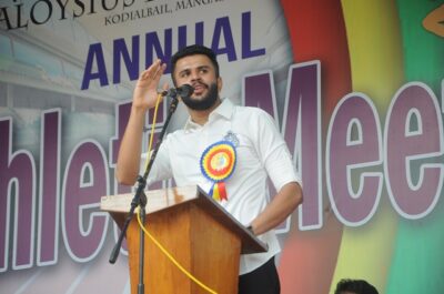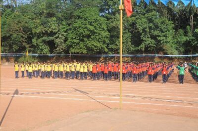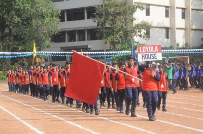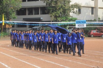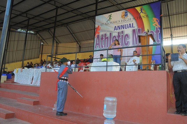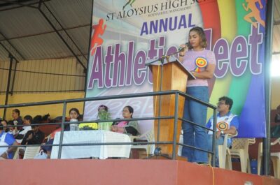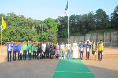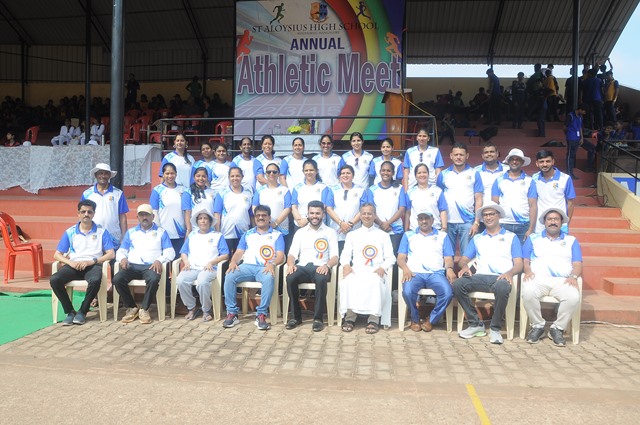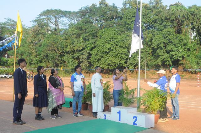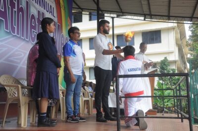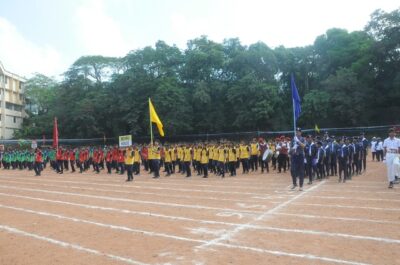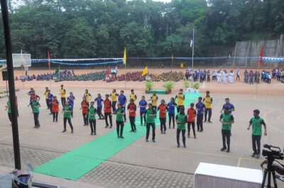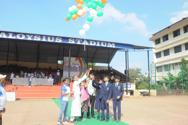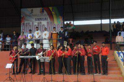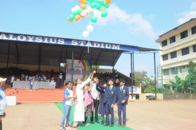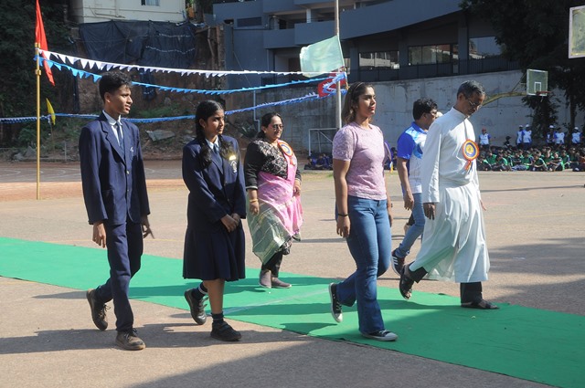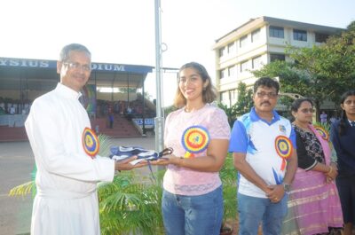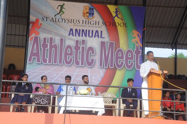 The annual athletic meet of St Aloysius high school was conducted on 19th November 2025. The guests Mr Eshwar P Shetty alumnus Entrepreneur and marketing professional, Headmaster Rev. Fr. Johnson R Pinto S.J., Assistant Headmaster Mr. Lancy D’souza, PTA Vice – President Mrs. Reshma Bhat, were escorted by the school pupil leaders and NCC cadets along with the school band. The sports flag was handed over to the athletes by the chief guest followed by wonderful march-past headed by various house leaders and their members with flags.
