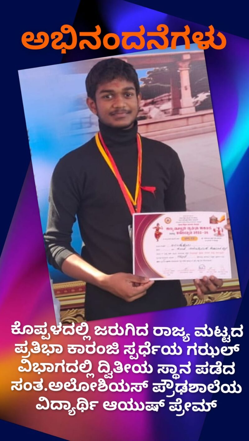 Ayush Prem bagged 2nd place in State Level Gazal Singing organised by the Education Department. In this Academic year he bagged 1st place in Hindustani Classical singing Competition conducted by Ragataranga, 1st place in Kanakadasa keerthane singing organised by Kanaka Adhyayana Peetha, Mangalore University. 1st place in Gazal singing competition at cluster level “Prathibha Karanji”. ...Read More